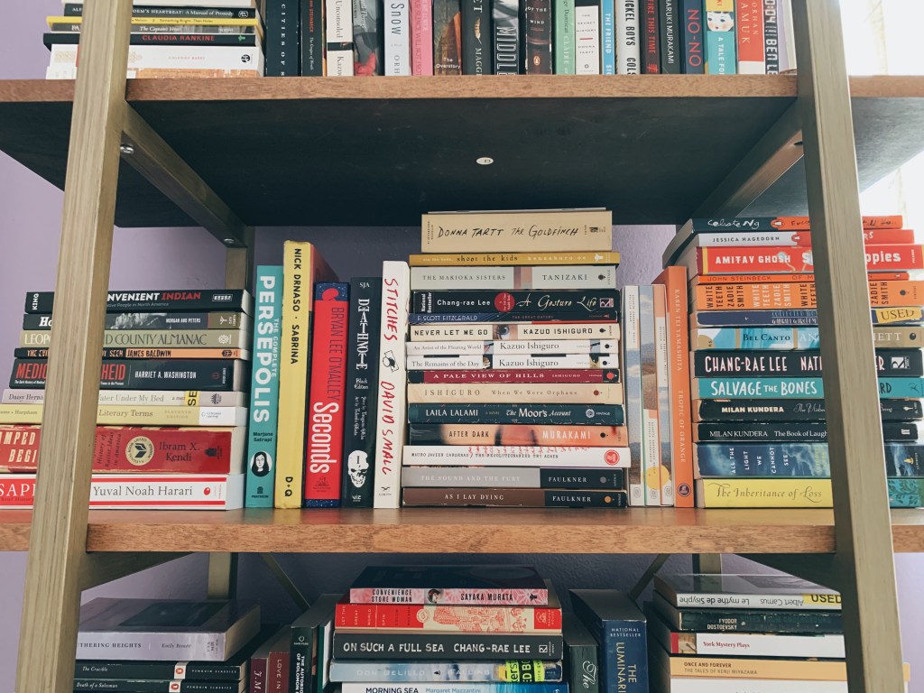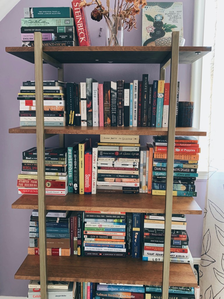 In the middle, I have a horizontal stack of fiction novels that I feel neutral about. These were all fairly good— good enough for me to keep and recommend now and again— but I don’t feel too strongly about many of them. However, the two vertical fiction books (The Master and Margarita, The Luminaries) are some of my favorites that I couldn’t fit elsewhere.