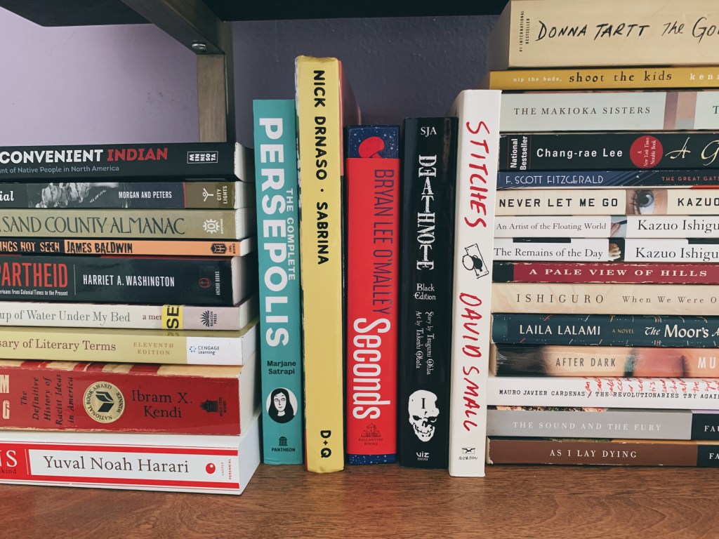 To the right of the nonfiction books are five graphic novels. They are each different from one another, but are all fantastic! The rest of this shelf is filled with paperback fiction books I’ve read and enjoyed.