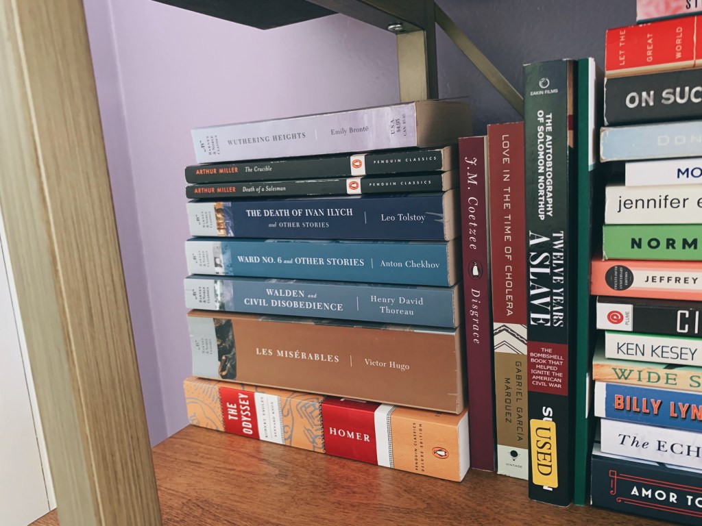 On the left, I have some classics that I’ve read for school or picked up on my own. A few of these books remain unread (like Les Mis, which I hope to get to someday!).