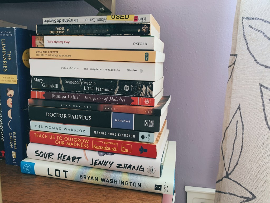 On the right, I have short stories, essays, and plays. I would highly recommend Lot by Bryan Washington, The Woman Warrior by Maxine Hong Kingston, and Interpreter of Maladies by Jhumpa Lahiri.