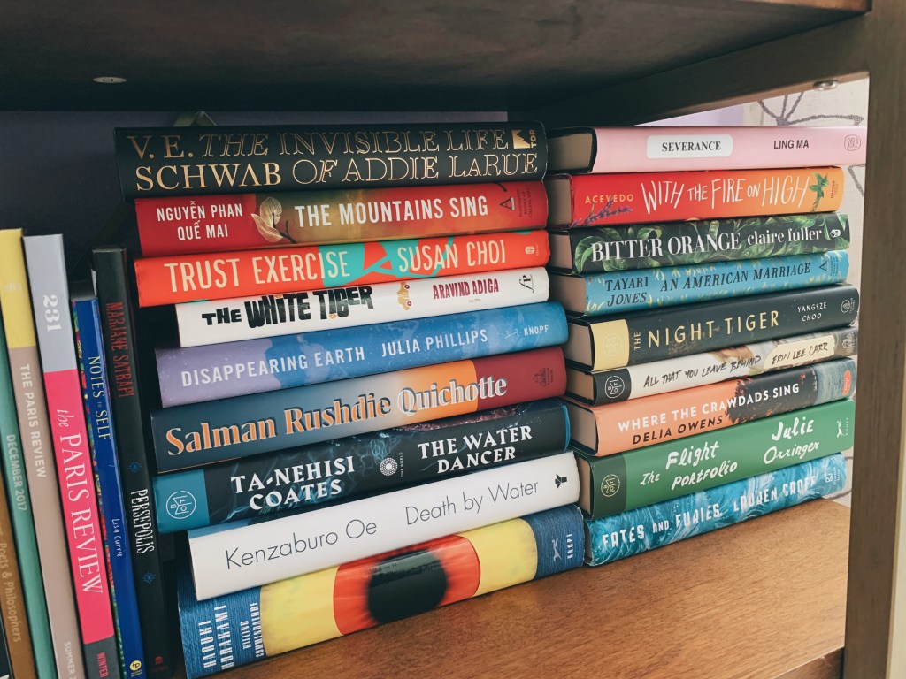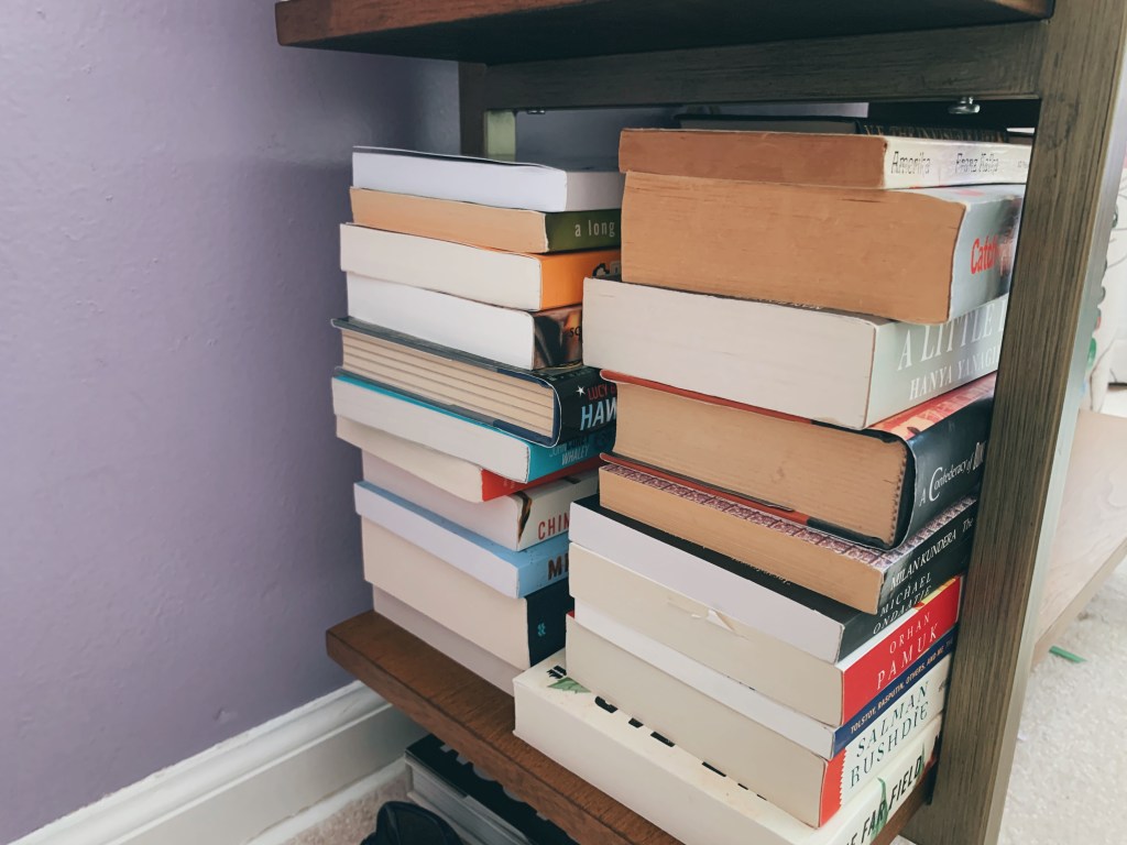 Hardcover books can be so difficult to fit into a bookshelf! I try not to buy hardbacks very often— they are expensive and bulkier to carry around— but I was subscribed to Book of the Month for a while and accumulated a small collection. In these stacks, I most enjoyed “Disappearing Earth” by Julia Phillips and “The White Tiger” by Aravind Adiga.