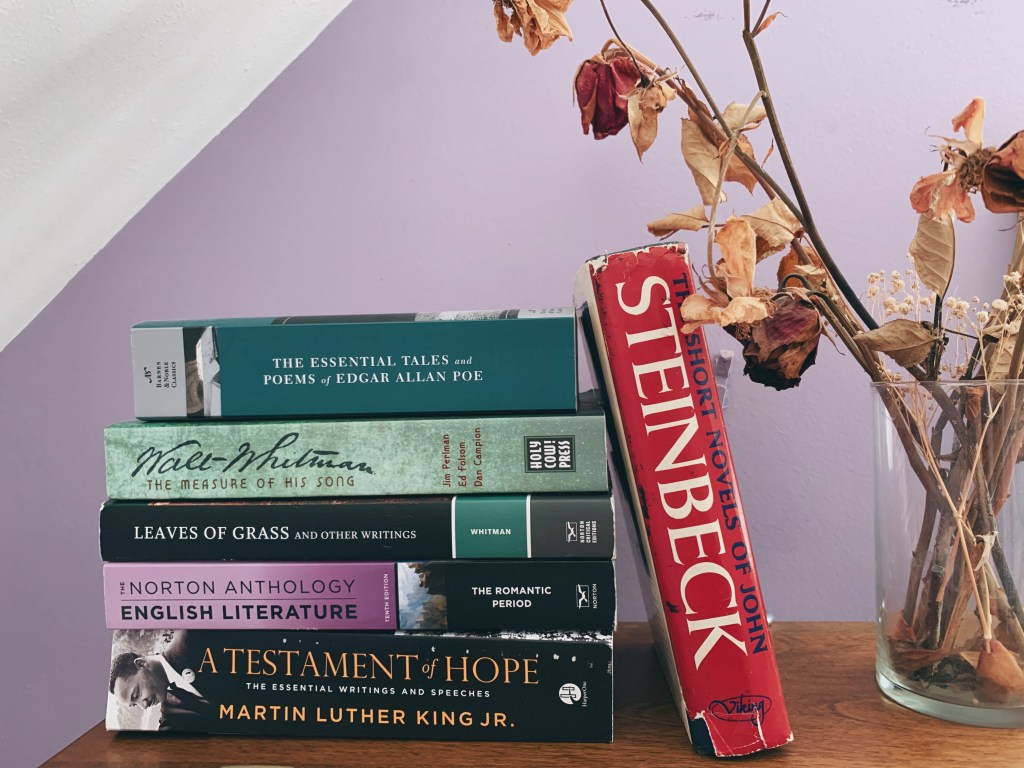 My poetry books are stacked on the left side of this shelf. The rest of the shelf is filled with my favorite books vertically— since lining books up vertically can take up a lot of space, this is one of the only parts of my collection stacked this way. There’s no order to how the books are lined up, but these are all some of my most highly rated and treasured reads. The rest of my favorite books (like my Baldwin collection, and favorite Russian lit) and poetry collections are on my apartment shelves!